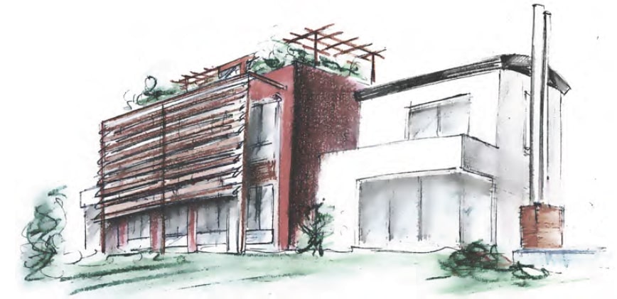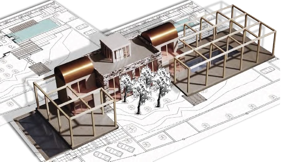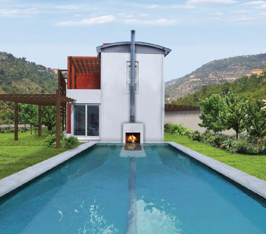 Floor to ceiling windows and doors diminish the severity of the volumes while taking advantage of the natural light. This building that hosts two residencies for a brother and sister is laid out along a main axis, which serves as an imposing façade. The interior is quite simple, with a loft like living room with a fire place by the swimming pool and an active kitchen. Three bedrooms are upstairs. There is a roof terrace by the vaulted zinc roof above the master bedroom. Large windows in the dinning room, a corner window in the living room, facing south are contrasting with smaller ones on the north side, letting in light while defining specific rooms of the house. A glass opening at the back of the fire place, allows for a dialogue between water and fire!